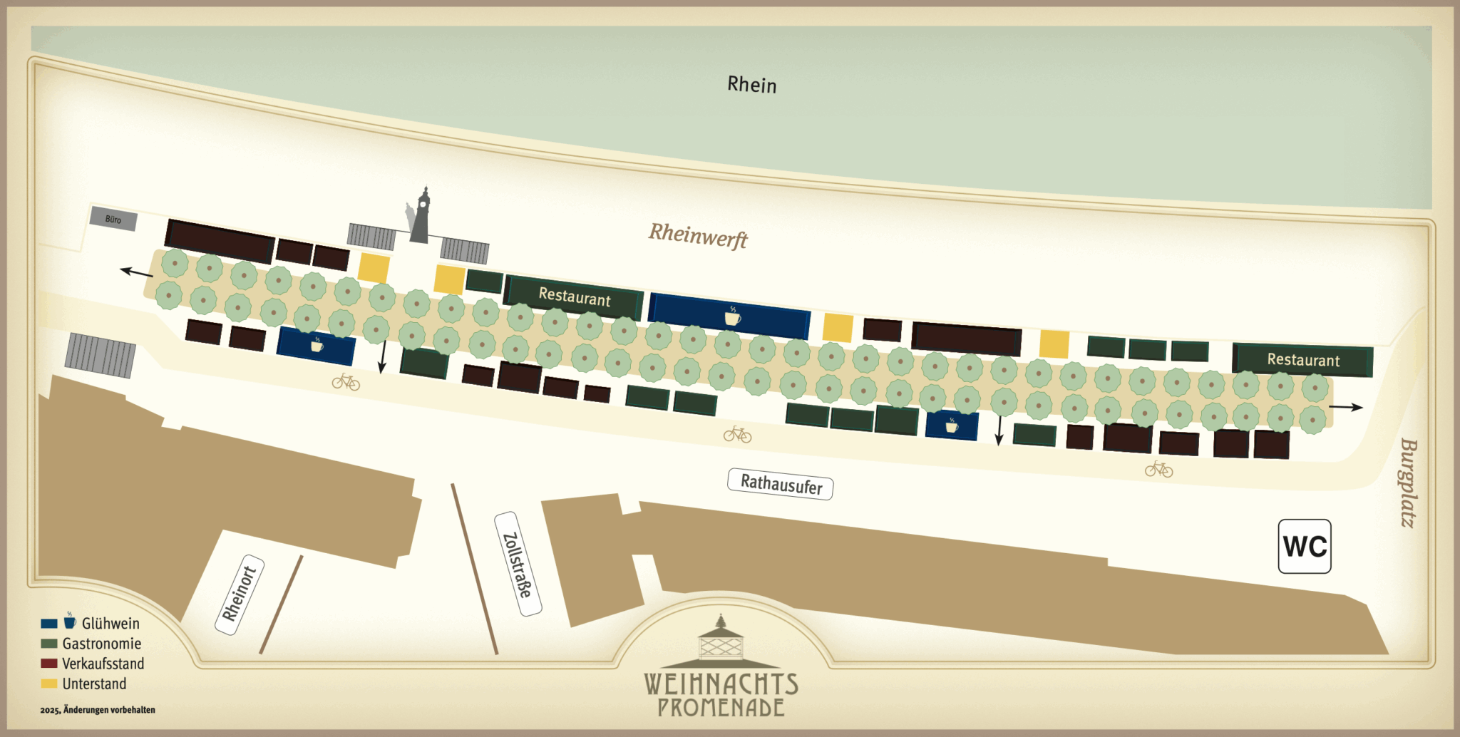 Zwischen Burgplatz und Alter Hafen bietet Roncalli’s Weihnachtspromenade eine romantisch weihnachtliche Flaniermeile direkt am Rheinufer – mit einer Mischung aus Kunst, Kultur und kulinarischen Genüssen. Historische Food Trucks und nostalgische Verkaufswagen aus der Privatsammlung von Zirkusdirektor Bernhard Paul sowie – vom Jugendstil inspirierte – gläserne Orangerien, verwandeln die Weihnachtspromenade zu einem besonderen Ort für Freunde von Ästhetik und Genuss. In exklusiven Boutiquen und den gläsernen Orangerien finden Besucher der Weihnachtspromenade ausgewählte Händler, hochwertige Präsente und handgefertigte Unikate. Ein besonderes Highlight der Weihnachtspromenade sind die beiden überdachten Pop-up-Restaurants, die im gehobenen Ambiente zum stilvollen Genießen und Verweilen einladen. Mit dem Blick auf den Rhein lassen sich hier auch Weihnachtsfeiern veranstalten.